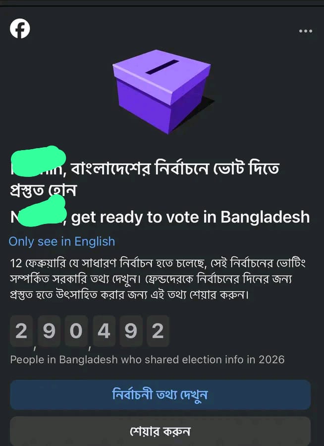 ত্রয়োদশ জাতীয় সংসদ নির্বাচনকে সামনে রেখে বাংলাদেশে অবস্থানরত ফেসবুক ব্যবহারকারীদের জন্য ‘বিশেষ বিজ্ঞপ্তি’ দেখাচ্ছে সামাজিক যোগাযোগমাধ্যমটি। মোবাইল অ্যাপ কিংবা ব্রাউজার ReadMore..